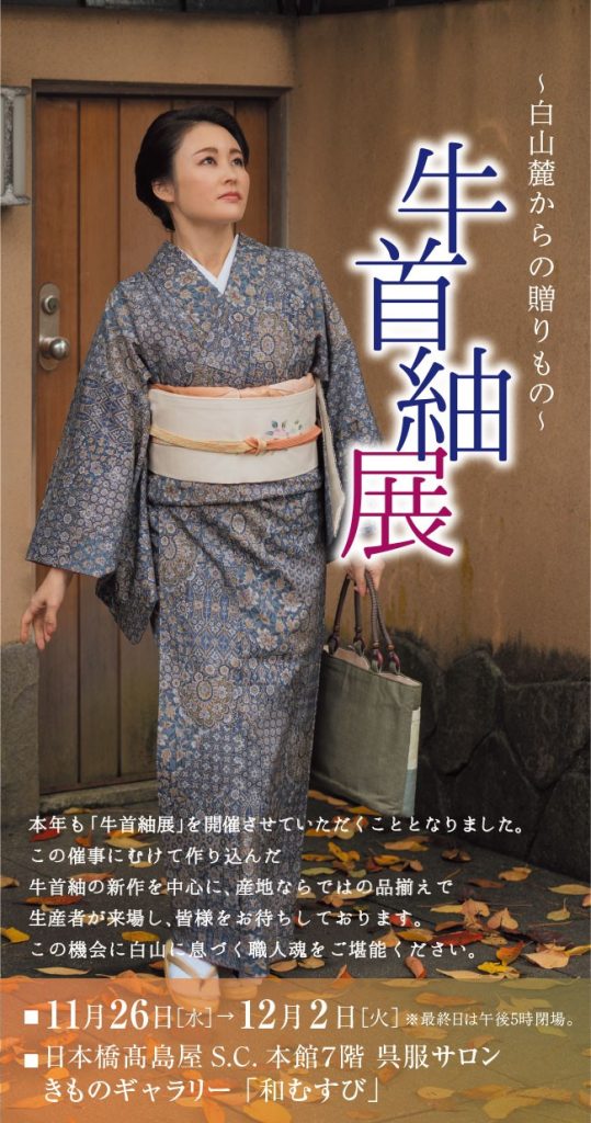 日本橋高島屋S.C. 本館7階呉服サロン きものギャラリー「和むすび」に於きまして「~白山麓からの贈りもの~牛首紬展」を開催中です。